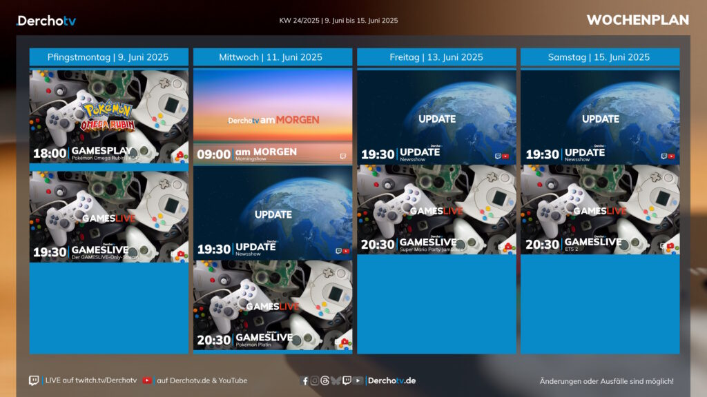 Am Pfingstmontag (09.06.) gibt es um 18 Uhr eine neue Folge von „Pokémon Omega Rubin“ auf YouTube und hier auf Derchotv.de Am Abend gibt einen GAMESLIVE-Only-Stream, mit einem oder zwei Spiele. Los geht’s ab 19:30 Uhr. Am Mittwoch (11.06.) gibt es wieder die Morningshow Derchotv am MORGEN ab 9 Uhr. Am Abend gibt es dann UPDATE. Danach natürlich GAMESLIVE mit „Pokémon Platin“. Am Freitag (13.06.) gibt es wieder ab 19:30 Uhr einen Stream. Wieder mit UPDATE und danach mit GAMESLIVE und „Mario Party Jamboree“. Ob mit mehreren Leuten oder nur alleine, wird spontan entschieden. Am Samstag gibt es auch wieder um 19:30 Uhr dann UPDATE und bei GAMESLIVE dann „Euro Truck Simulator 2“.
