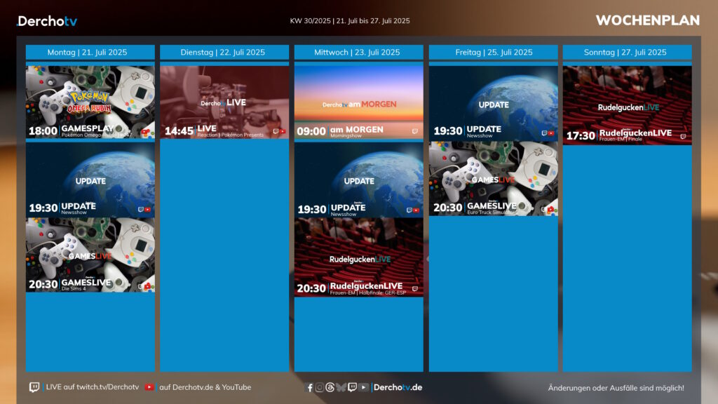 Am Mittwoch gibt es Derchotv am MORGEN von 9 bis 11 Uhr. Am Abend dann UPDATE um 19:30 Uhr und danach dann RudelguckenLIVE mit dem Halbfinalspiel der Frauen-Fußball-EM zwischen Deutschland und Spanien.