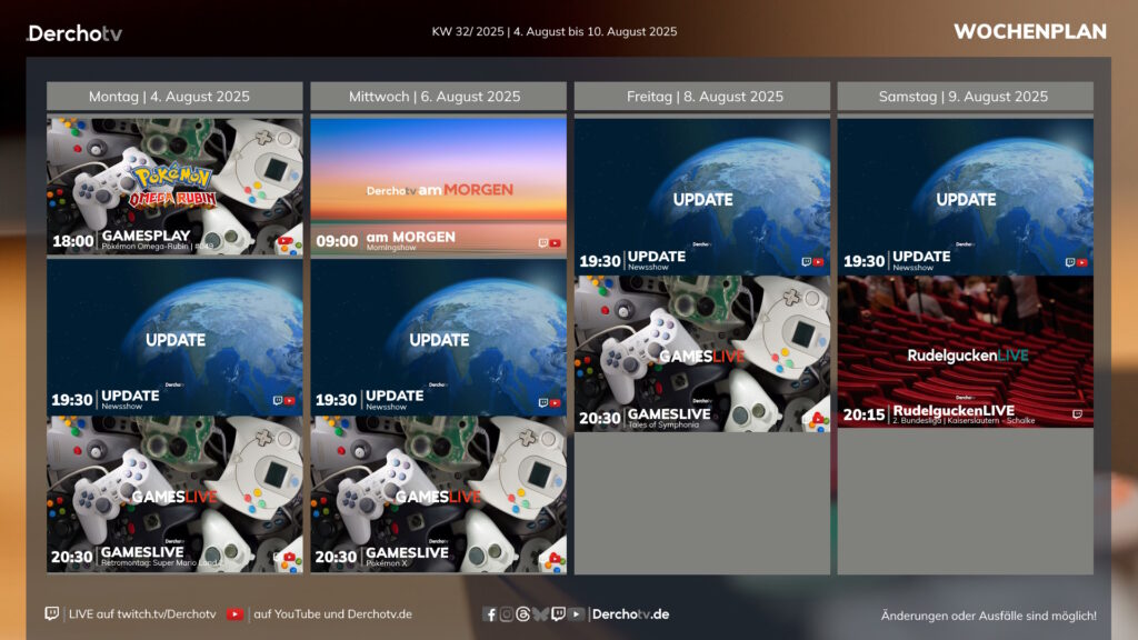 In der ersten vollen August-Wochen 2025 gilt das neue Schema für GAMESLIVE. Montags gibt es Retrogaming, mittwochs gibt es Pokémon und am Wochenende sowie dem Freitag verschiedene Games. So sieht die Woche aus.
