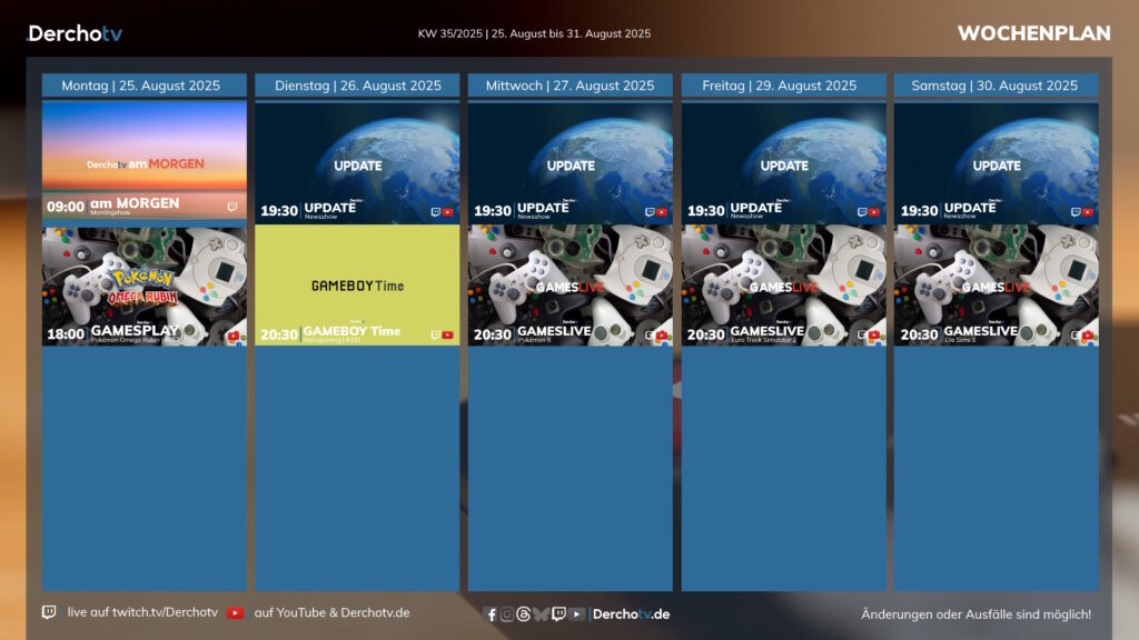 So kehrt am Montag (25.08.) die Morningshow „Derchotv am MORGEN“ wieder aus einer kleinen Pause zurück. Von 9 bis 11 Uhr gibt es wieder News zum Frühstück oder News bei der Arbeit. Um 18 Uhr gibt es auf YouTube wieder eine neue Folge von „Pokémon Omega-Rubin“. Der Abendstream wird auf den Dienstag (26.08.) verschoben. Heißt: Es gibt am Dienstag ab 19:30 Uhr erst „UPDATE“ und danach dann Folge 331 von „GAMEBOY Time“ um 20:30 Uhr.
