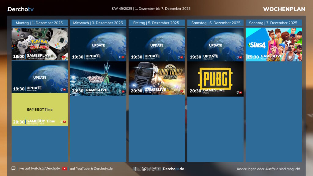 Die erste komplette Dezemberwoche, und da gibt es bei Derchotv schon ein paar Highlights. Bei GAMESLIVE alleine vier verschiedene Spiele und GAMEBOY Time zum Start der Woche. In dieser Woche aber keine Morningshow!
