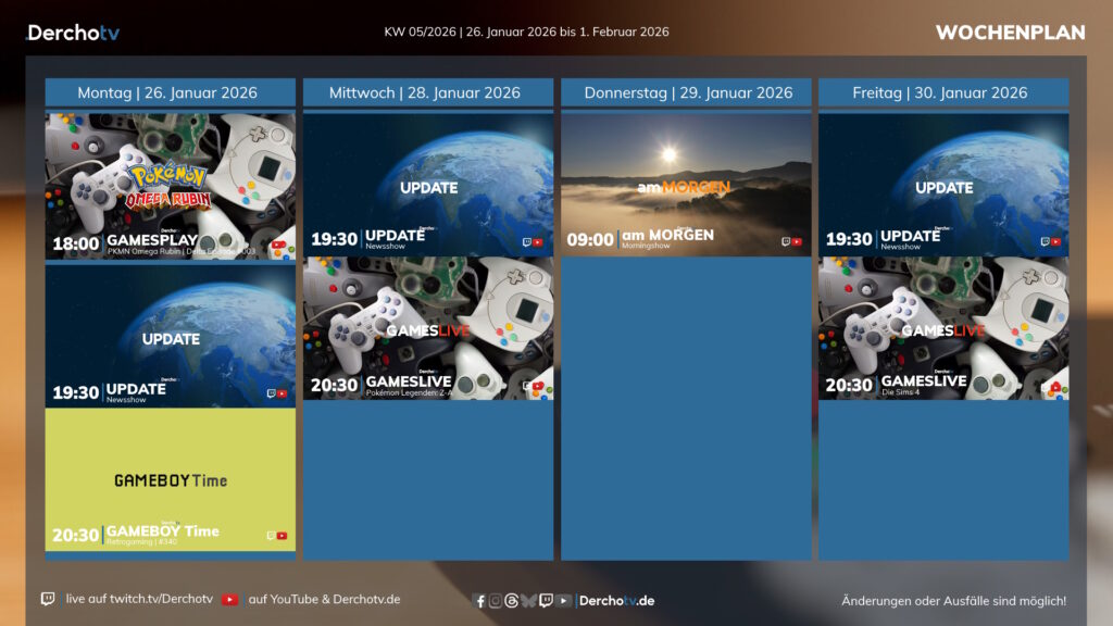 In der letzten Januarwoche 2026 wird es am Samstag keinen Stream geben. Es gibt mal ein Wochenende Pause auf Twitch. Aber „GAMEBOY Time“ ist zurück. Am Montag (26.01.) gibt es die 340. Folge der Retrosendung von Derchotv.